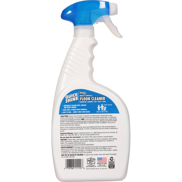 Directions: Simply mist onto floor or directly on cleaning pad. Spread with a clean, freshly rinsed sponge or microfiber pad. Rinse and wring cleaning pad often to release dirt and prevent streaking and hazing. Hint: if your floor has lost its original shine, apply quick shines floor finish to protect and add a durable high gloss. Maintain the quick shines finish by cleaning with quick shines multi-surface floor cleaners. They will not dull the finish like other cleaners. Safe for most surfaces including tile, grout and sealed wood floors. Not recommended for unfinished or unsealed wood surfaces. Try first in unobtrusive spot and check for satisfactory results.
