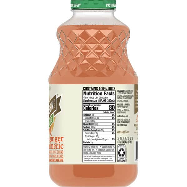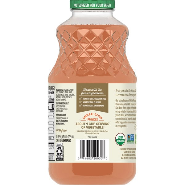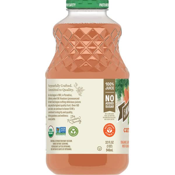• CONTAINS: One (1) 32-fluid ounce glass bottle of R.W. Knudsen Family Organic Carrot Ginger Turmeric Beverage