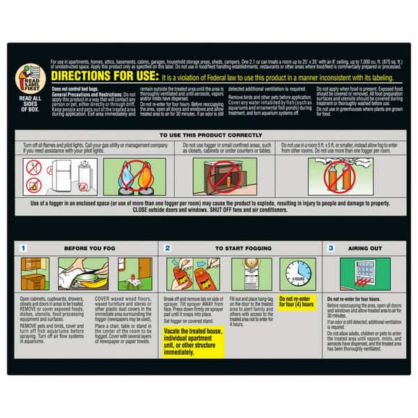 DIRECTIONS FOR USE: It is a violation of Federal Law to use this product in a manner inconsistent with its labeling. Does not control bed bugs. General Precautions and Restrictions: Do not apply this product in a way that will contact any person or pet, either directly or through drift. Keep people and pets out of the treated area during application. Exit area immediately and remain outside the treated area until the area is thoroughly ventilated and until aerosols, vapors and/or mists have dispersed. Do not re-enter for four hours. Before reoccupying the area, open all doors and windows and allow treated area to air for 30 minutes. if an odor s still detected additional ventilation is required.mRemove birds and other pets before application. Cover any water inhabited by fish (such as aquariums and ornamental fish ponds) during treatment, and turn aquarium systems off. Do not apply when food is present. Exposed food should be covered or removed. All food preparation surfaces and utensils should be covered during treatment or thoroughly washed before use. Fo not use in greenhouses where plants are grown for food.