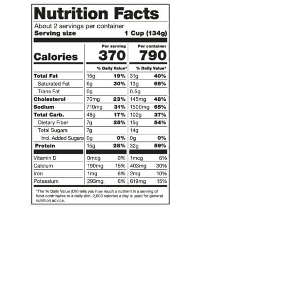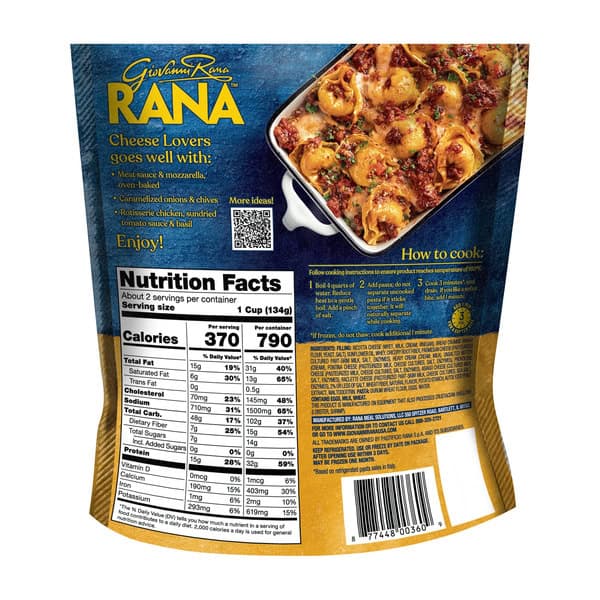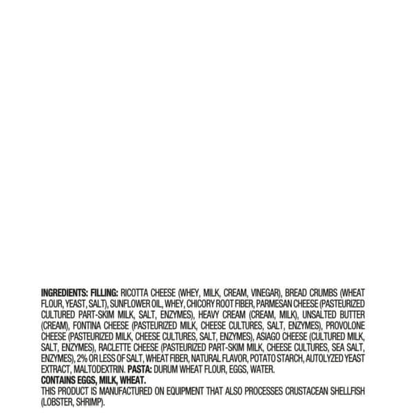 Filling (ricotta (whey, Whole Milk, Cream, Vinegar), Mascarpone Cheese (pasteurized Milk, Cream, Citric Acid), Parmigiano Reggiano Cheese (cow’s Milk, Salt, Rennet), Mozzarella Cheese (pasteurized Cultured Milk, Salt, Enzymes), Bread Crumbs (wheat Flour, Yeast, Salt), Pecorino Romano Cheese (pasteurized Cultured Sheep’s Milk, Rennet, Salt), Chicory Root Fiber, Cornstarch, Potato Starch, Dehydrated Potatoes, Vegetable Fiber, Natural Flavors, Salt). Pasta (durum Wheat Flour, Eggs, Water).