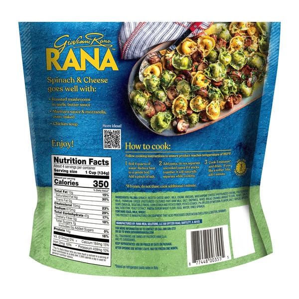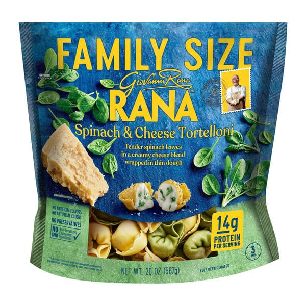 Giovanni Rana’s spinach and cheese tortellini is made with baby spinach and a blend of ricotta and Parmesan cheeses wrapped in a thin dough. Using high quality ingredients and no preservatives, no powdered eggs, no gums, no hydrogenated fats, and no artificial flavors or colors Giovanni Rana’s pasta makes a wonderful choice for meals. Preparing our tortellini in three easy steps: