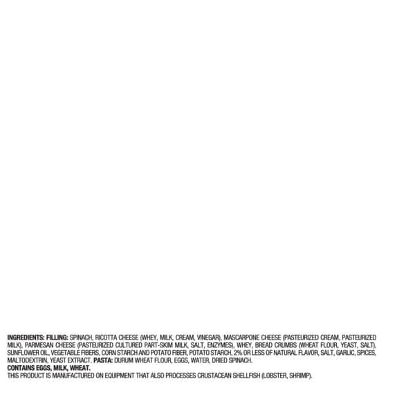 Filling (spinach, Ricotta (whey, Whole Milk, Cream, Vinegar), Seasoning (water, Sunflower Oil, Potato Starch, Casein, Salt), Bread Crumbs (wheat Flour, Yeast, Salt), Whey, Parmesan Cheese (pasteurized Cultured Milk, Salt, Enzymes), Unsalted Butter (cream), Dehydrated Potatoes, Cornstarch, Natural Flavors, Potato Starch, 2% Or Less Of Vegetable Fiber, Salt, Garlic, Black Pepper, Nutmeg). Pasta (durum Wheat Flour, Eggs, Water, Dried Spinach).