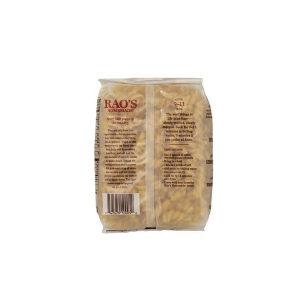 Bring home the famous taste of Raos Homemade pastas! Our delicious Fusilli is imported from Italy to bring the flavor of Italy right to your table. Our pasta is made from house-milled durum semolina flour dried slow and low for delicious flavor and the perfect al dente texture. Our fusilli is a corkscrew shaped pasta that captures and holds onto sauce in each of its turns and curves, served best with a thick sauce. Delicious speaks for itself!
