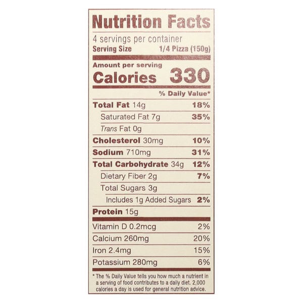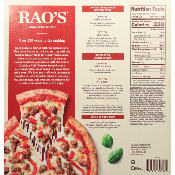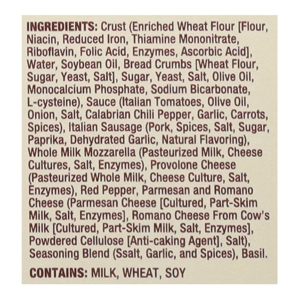 Crust (enriched Wheat Flour [flour, Niacin, Reduced Iron, Thiamine Mononitrate, Riboflavin, Folic Acid, Enzymes, Ascorbic Acid], Water, Soybean Oil, Bread Crumbs [wheat Flour, Sugar, Yeast, Salt], Sugar, Yeast, Salt, Olive Oil, Monocalcium Phosphate, Sodium Bicarbonate, L-cysteine), Sauce (italian Tomatoes, Olive Oil, Onion, Salt, Calabrian Chili Pepper, Garlic, Carrots, Spices), Italian Sausage (pork, Spices, Salt, Sugar, Paprika, Dehydrated Garlic, Natural Flavoring), Whole Milk Mozzarella (pasteurized Milk, Cheese Cultures, Salt, Enzymes), Provolone Cheese (pasteurized Whole Milk, Cheese Culture, Salt, Enzymes), Red Pepper, Parmesan And Romano Cheese (parmesan Cheese [cultured, Part-skim Milk, Salt, Enzymes], Romano Cheese From Cow’s Milk [cultured, Part-skim Milk, Salt, Enzymes], Powdered Cellulose [anti-caking Agent], Salt), Seasoning Blend (salt, Garlic, And Spices), Basil.