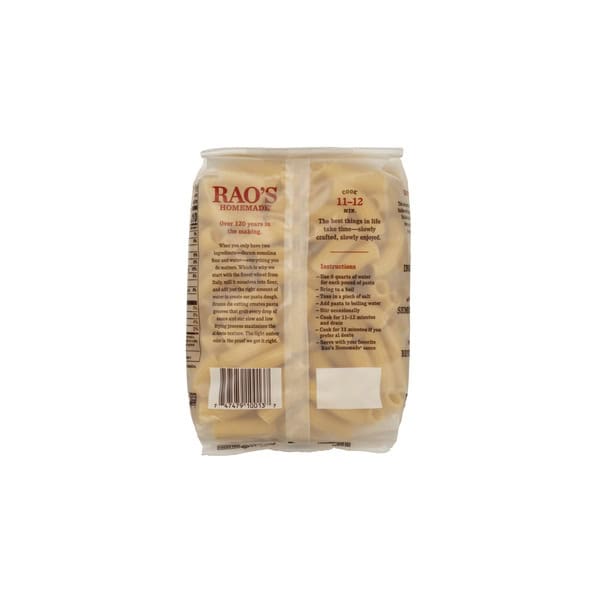 Cook 11-12 min. The best things in life take time-slowly crafted, slowly enjoyed. Instructions: Use 6 quarts of water for each pound of pasta. Bring to a boil. Toss in a pinch of salt. Add pasta to boiling water. Stir occasionally. Cook for 11-12 minutes and drain. Cook for 11 minutes if you prefer al dente. Serve with your favorite Rao’s Homemade sauce.