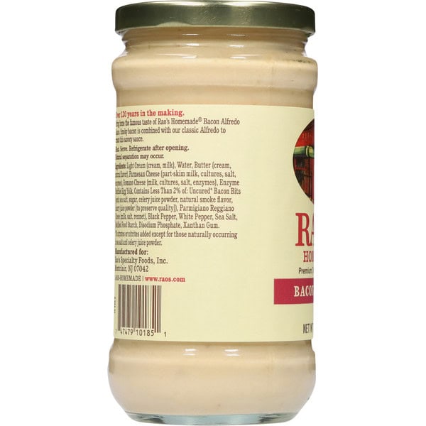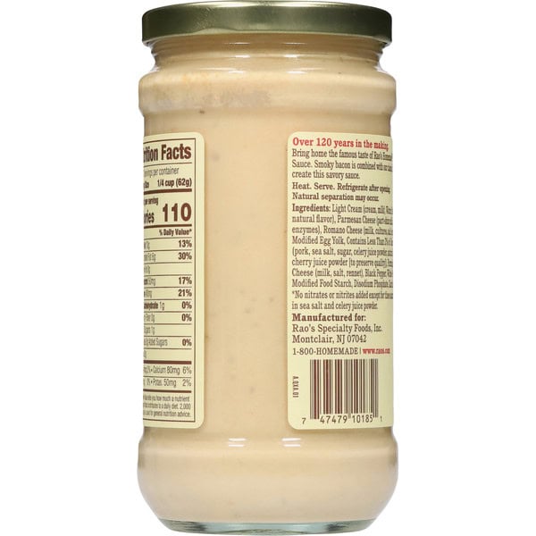 Light Cream (cream, Milk), Water, Butter (cream, Natural Flavor), Parmesan Cheese (part-skim Milk, Cultures, Salt, Enzymes), Romano Cheese (milk, Cultures, Salt, Enzymes), Enzyme Modified Egg Yolk, Contains Less Than 2% Of: Uncured* Bacon Bits (pork, Sea Salt, Sugar, Celery Juice Powder, Natural Smoke Flavor, Cherry Juice Powder [to Preserve Quality]), Parmigiano Reggiano Cheese (milk, Salt, Rennet), Black Pepper, White Pepper, Sea Salt, Modified Food Starch, Disodium Phosphate, Xanthan Gum. no Nitrates Or Nitrites Added Except For Those Naturally Occurring In Sea Salt And Celery Juice Powder.