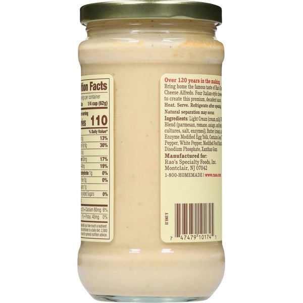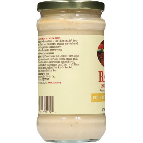 Light Cream (cream, Milk), Water, Four Cheese Blend (parmesan, Romano, Asiago, And Fontina Cheese [milk, Cultures, Salt, Enzymes]), Butter (cream, Natural Flavor), Enzyme Modified Egg Yolk, Contains Less Than 2% Of: Black Pepper, White Pepper, Modified Food Starch, Sea Salt, Disodium Phosphate, Xanthan Gum.