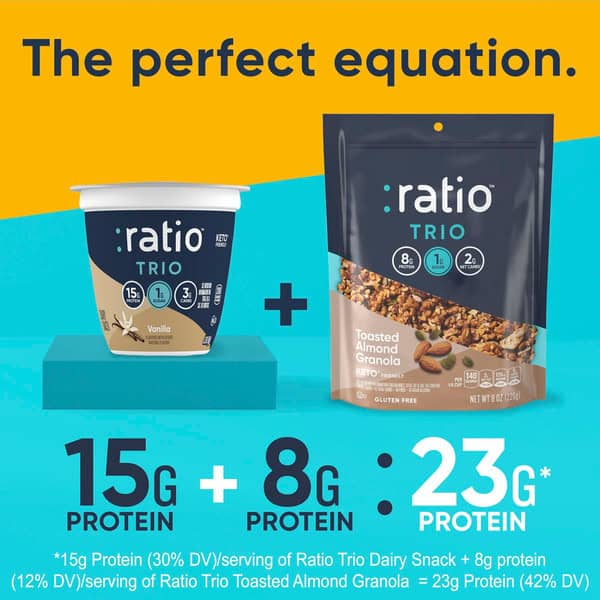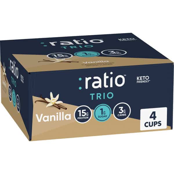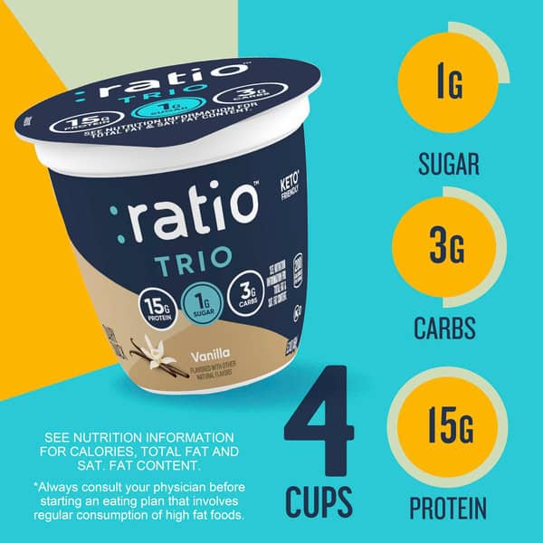 • CONTAINS: Four 5.3 oz cups of :ratio Trio Keto* Friendly Vanilla Yogurt Cultured Dairy Snack; 1 lb 5.2 oz total weight; *Always consult your physician before starting an eating plan that involves the regular consumption of high fat foods