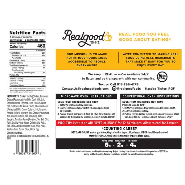 Microwave Oven Instructions: Cook from frozen/do not thaw. 1. Remove: Enchilada tray from box. 2. Leave Enchiladas wrapped in film and poke holes to ventilate. Place: Tray in microwave and heat on high for 3 minutes 30 seconds to 4 minutes 30 seconds. Let sit 1 minute. Enjoy. Conventional Oven Instructions: Cook from frozen/do not thaw. Preheat oven to 400 degrees. 1. Remove enchilada tray from box and remove film. 2. Leave enchiladas in tray. 3. Place tray on center rack In oven on an oven-proof sheet pan. Bake for 30-33 min. Let rest 1 minute. Enjoy. Pro Tip: Heat in an air fryer at 350 degrees F for 12-14 minutes. Allow to cool for 1 minute. Due to variations in ovens. Coking times may vary. Adjust cooking time to reach an internal temperature of 165 degrees F for safety and best quality.