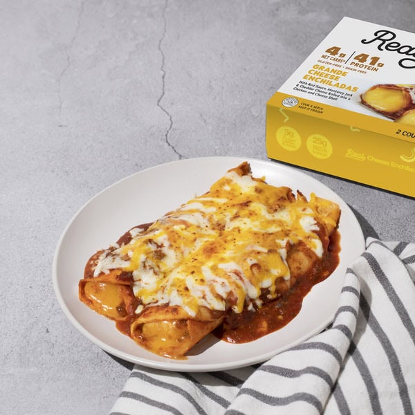 Delicious Low Carb, keto-friendly Cheese Enchiladas! Perfect for meal prep, or a quick and easy meal any time of day that’s packed with protein and low in sugar! Unlike other Mexican entrees, ours is gluten free, grain free, and low sugar; with only 4g Net Carbs and 41g Protein!Â