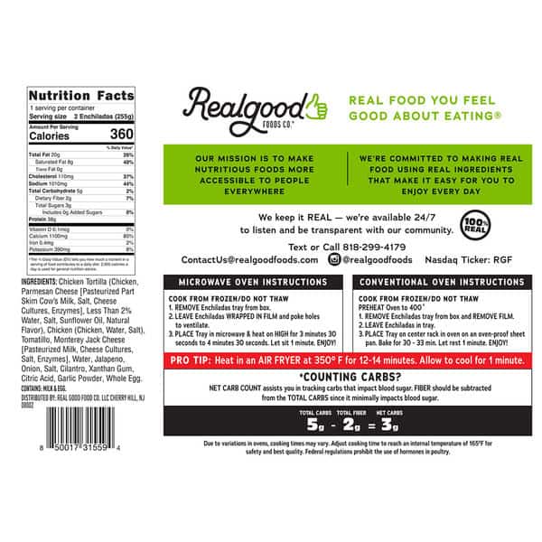 Microwave Oven Instructions: Coom from Frozen / Do not Thaw: 1. Remove Enchiladas tray from box. 2. Leave Enchiladas wrapped in film and poke holes to ventilate. 3. Place tray in microwave & heat on high for 3 minutes 30 seconds to 4 minutes 30 seconds. Let sit 1 minute. Enjoy! Conventional Oven Instructions: Cook from frozen / do not thaw. Preheat oven to 400 degrees. 1. Remove Enchiladas tray from box and remove film. 2. Leave Enchiladas in tray. 3. Place tray on center rack in oven on an oven-proof sheet pan. Bake for 30 – 33 min. Let rest 1 minute. Enjoy! Pro Tip: Heat in an air fryer at 350 degrees F for 12-14 minutes. Allow to cool for 1 minute. Due to variations in ovens, cooking times may vary. Adjust cooking time to reach an internal temperature of 165 degrees F for safety and best quality. Federal regulations prohibit the use of hormones in poultry.