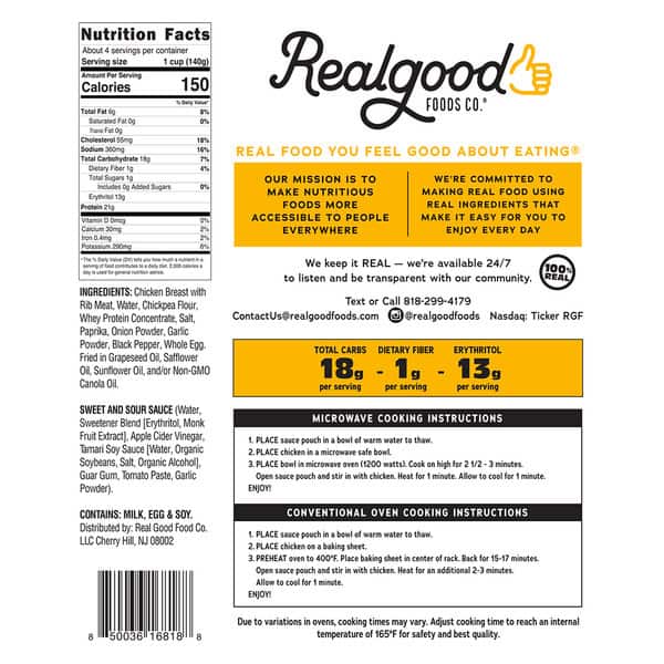 Breaded Chicken (chicken [chicken, Water, Low Sodium Phosphate, Seasonings], Grapeseed Oil, Chickpea, Whey Protein Concentrate, Water, Maple Fiber, Salt, Paprika, Onion, Garlic, Black Pepper, Whole Egg), Sweet And Sour Sauce (water, Sweetener Blend [erythritol, Monk Fruit Extract], Apple Cider Vinegar, Tamari Soy Sauce [water, Organic Soybeans, Salt, Organic Alcohol], Guar Gum, Tomato, Garlic)