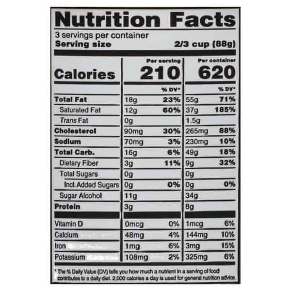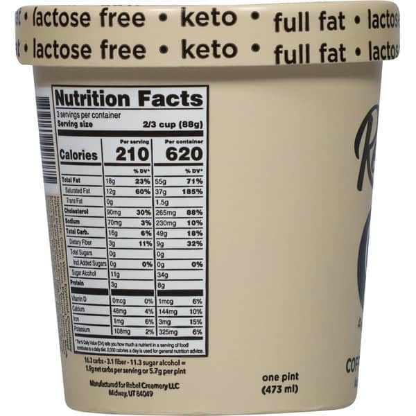Cream, Water, Erythritol, Chocolatey Flakes (coconut Oil, Cocoa, Erythritol, Sunflower Lecithin, Salt, Dutched Cocoa, Vanilla Extract, Monk Fruit), Vegetable Glycerin, Egg Yolks, Chicory Root Fiber, Coffee, Milk Protein Isolate, Lactase Enzyme, Peruvian Carob Gum, Guar Gum, Salt, Monk Fruit.