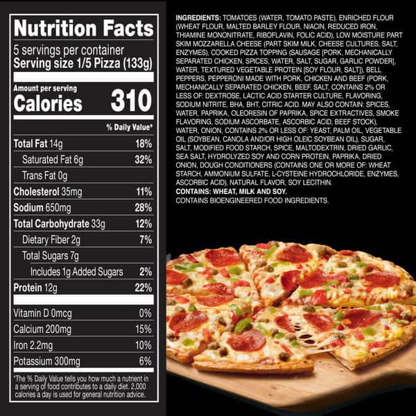 Tomatoes (water, Tomato Paste), Enriched Flour (wheat Flour, Malted Barley Flour, Niacin, Reduced Iron, Thiamine Mononitrate, Riboflavin, Folic Acid), Low Moisture Part Skim Mozzarella Cheese (part Skim Milk, Cheese Cultures, Salt, Enzymes), Cooked Pizza Topping (sausage [pork, Mechanically Separated Chicken, Spices, Water, Salt, Sugar, Garlic Powder], Water, Textured Vegetable Protein [soy Flour, Salt]), Bell Peppers, Pepperoni Made With Pork, Chicken And Beef (pork, Mechanically Separated Chicken, Beef, Salt, Contains 2% Or Less Of: Water, Dextrose, Spices, Smoke Flavoring, Lactic Acid Starter Culture, Sodium Ascorbate, Flavoring, Garlic Powder, Sodium Nitrite, Bha, Bht, Citric Acid, Contains One Or More Of: Paprika, Oleoresin Of Paprika), Water, Onion, Contains 2% Or Less Of: Yeast, Palm Oil, Vegetable Oil (soybean And/or Canola Oil), Sugar, Salt, Modified Food Starch, Spice, Maltodextrin, Dried Garlic, Sea Salt, Hydrolyzed Soy And Corn Protein, Paprika, Dried Onion, Wheat Starch, L-cysteine Hydrochloride, Ammonium Sulfate, Natural Flavor, Soy Lecithin, Enzymes (contains Wheat), Ascorbic Acid (dough Conditioner).