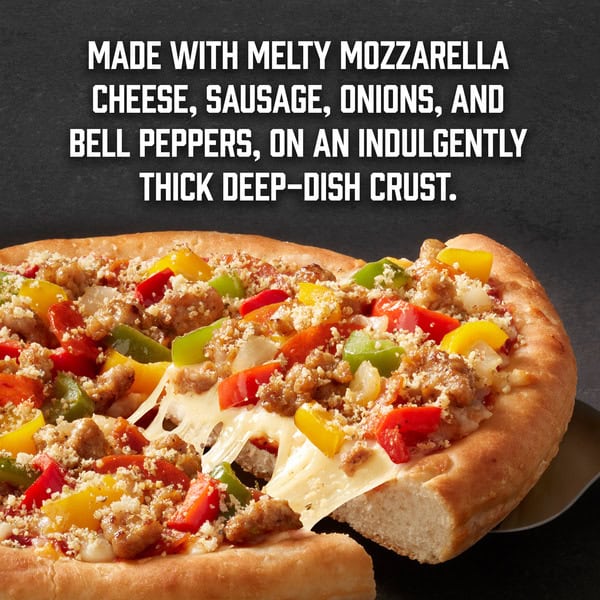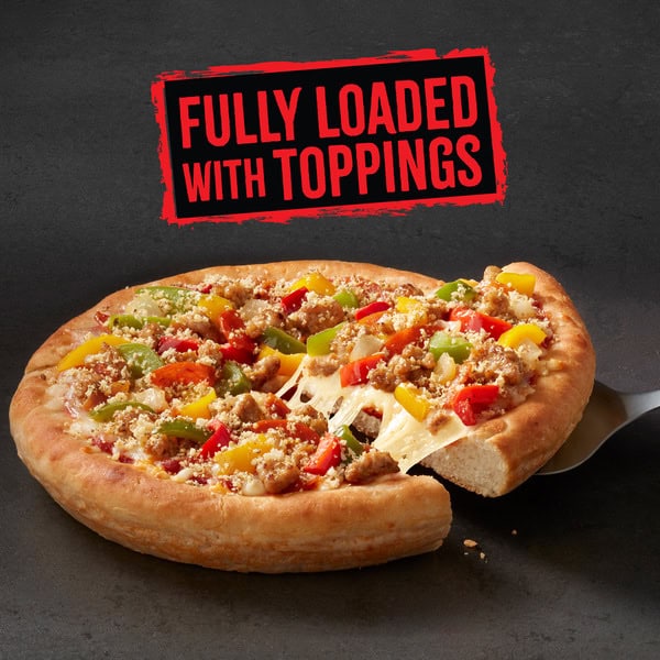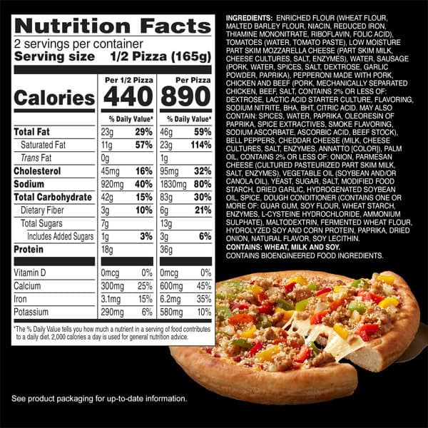 Enriched Flour (wheat Flour, Malted Barley Flour, Niacin, Reduced Iron, Thiamine Mononitrate, Riboflavin, Folic Acid), Tomatoes (water, Tomato Paste), Low Moisture Part Skim Mozzarella Cheese (part Skim Milk, Cheese Cultures, Salt, Enzymes), Water, Sausage (pork, Water, Spices, Salt, Dextrose, Garlic Powder, Paprika), Pepperoni Made With Pork, Chicken And Beef (pork, Mechanically Separated Chicken, Beef, Salt, Contains 2% Or Less Of: Dextrose, Lactic Acid Starter Culture, Flavoring, Sodium Nitrite, Bha, Bht, Citric Acid. May Also Contain: Spices, Water, Paprika, Oleoresin Of Paprika, Spice Extractives, Smoke Flavoring, Sodium Ascorbate, Ascorbic Acid, Beef Stock), Bell Peppers, Cheddar Cheese (milk, Cheese Cultures, Salt, Enzymes, Annatto [color]), Palm Oil, Contains 2% Or Less Of: Onion, Parmesan Cheese (cultured Pasteurized Part Skim Milk, Salt, Enzymes), Vegetable Oil (soybean And/or Canola Oil), Yeast, Sugar, Salt, Modified Food Starch, Dried Garlic, Hydrogenated Soybean Oil, Spice, Dough Conditioner (contains One Or More Of: Guar Gum, Soy Flour, Wheat Starch, Enzymes, L-cysteine Hydrochloride, Ammonium Sulphate), Maltodextrin, Fermented Wheat Flour, Hydrolyzed Soy And Corn Protein, Paprika, Dried Onion, Natural Flavor, Soy Lecithin.