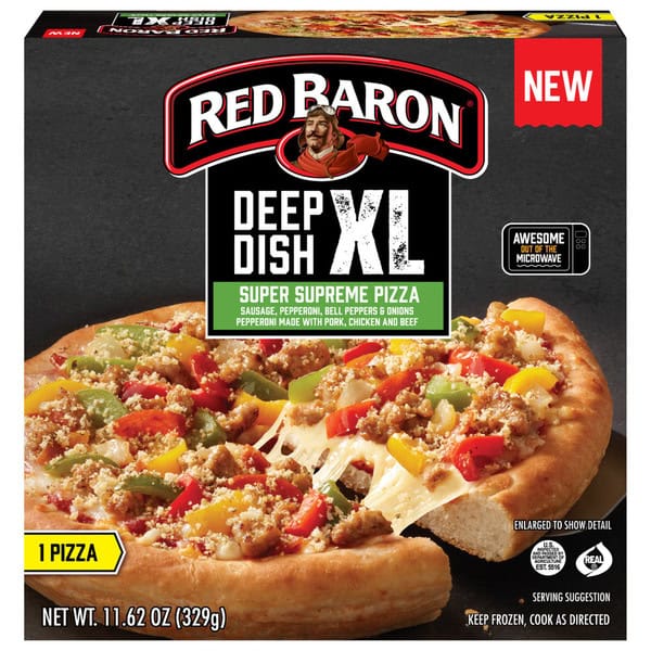 Meet the newest size in the Red Baron Pizza family, Red Baron Deep Dish XL Super Supreme Frozen Pizza. Savor the mouthwatering taste of zesty tomato sauce, melty mozzarella cheese, and loaded with hearty sausage, pepperoni, onions, and bell peppers, all piled on top of our crispy, indulgently thick deep-dish crust. Our Deep Dish XL is so big we can’t call it single-serve. Ready in minutes from the microwave, Deep Dish XL is a filling part of a meal. Whether it’s part of a mid-week dinner or a late-night study session with friends, our pizzas are ready whenever you need them. Make your next meal memorable with other Red Baron favorites such as Classic Crust, Brick Oven, Stuffed Crust, and Fully Loaded Hand Tossed. Bring the tasty buzz of excitement when you Share Something Awesome!