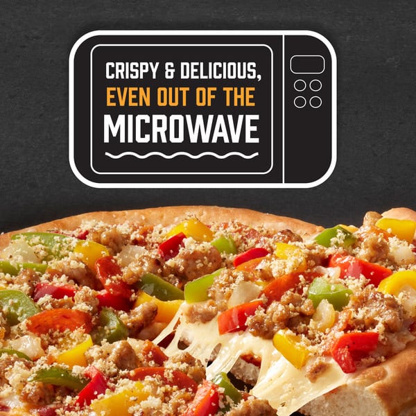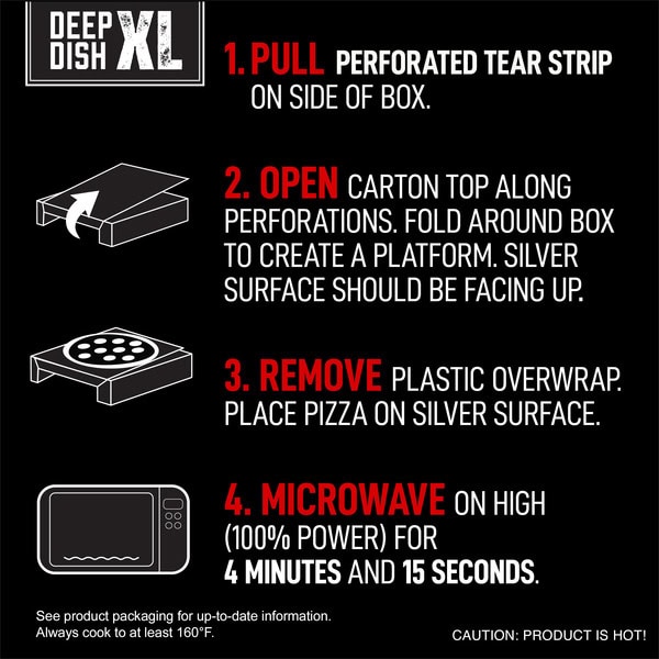 MICROWAVE OVEN: 1. PULL perforated tear strip on side of box. 2. OPEN carton top along perforations. Fold around box to create a platform. Silver surface should be facing up. 3. REMOVE plastic overwrap. Place pizza on silver surface. 4. Microwave on High (100% power) for 4 Minutes and 15 seconds. Microwave then Air Fry 1. Preheat Air Fryer to 300°F. 2. Pull perforated tear strip on side of box. 3. Open carton top along perforations. Fold around box to create a platform. Silver surface should be facing up. 4. Remove plastic overwrap. Place pizza on silver surface. 5. Microwave on High (100% Power) for 3 minutes and 30 seconds. 6. Carefully place pizza in preheated Air Fryer and Air Fry pizza 2 minutes. Microwave then Conventional Oven 1.Preheat Conventional (or Toaster) oven to 400°F. 2. Pull perforated tear strip on side of box. 3. Open carton top along perforations. Fold around box to create a platform. Silver surface should be facing up. 4. Remove plastic overwrap. Place pizza on silver surface. 5. Microwave on high (100% power) for 2 minutes 6. Carefully place pizza on a pan and bake on center rack for 10-12 minutes. Don’t forget Take Pizza out of the box and wrapper before cooking. Do not thaw pizza. Let cool for at least 1-2 minutes. For food safety and quality, cook until the internal temperature is 160F before eating. Cooking appliances may vary. Adjust cooking time and temperature accordingly. Refrigerate or discard any unused portion. Pizza is done when center cheese is melted and edges are golden brown. Do not eat pizza without cooking.