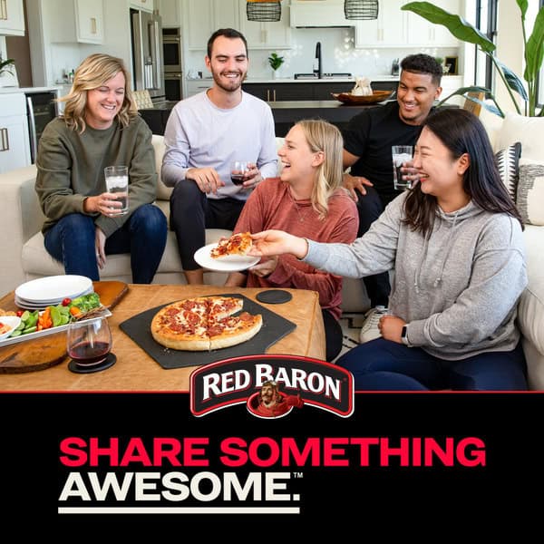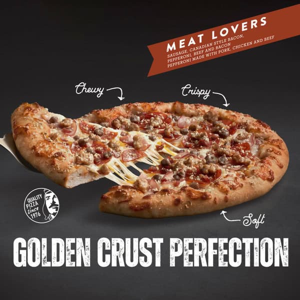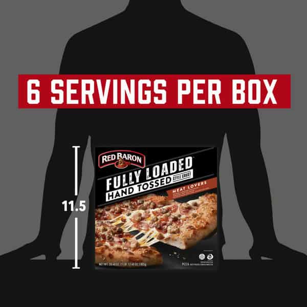 RED BARON FULLY LOADED Hand Tossed Style Meat Lovers Pizza – One bite into our Hand Tossed Style Meat Lovers pizza and you know this will be a moment to remember. Our FULLY LOADED Hand Tossed Style pizza crust will soon become your favorite in the frozen aisle; the golden crust bakes to pillowy, chewy perfection. Fully loaded with a half-pound of delicious, premium toppings, you’ll savor the taste of mozzarella and cheddar cheeses, sausage, Canadian style bacon, pepperoni, beef and bacon. Our FULLY LOADED Hand Tossed Style Meat Lovers pizza is an excellent source of protein and is made with real cheese so you can feel good about every slice you serve. Whether it’s part of a mid-week family dinner, a late-night study session with friends, or a quick snack before sports practice, let our frozen pizzas help you and the people you love savor every moment. Easy to make and easier to enjoy, this frozen pizza serves up quality and flavor in minutes so you can get back to what matters. Just bake this frozen pizza on a baking pan for 25-27 minutes at 400°F and you’re ready to serve a savory and indulgent Meat Lovers pizza that will satisfy everyone around your table. Keep pizza frozen until you’re ready to enjoy. No matter the occasion, you can count on RED BARON pizza to please the crowd. You can quickly bake our frozen pizza as part of an easy dinner, giving your family more time to catch up over every cheese and meat-packed bite. Everyone at your next pizza party will buzz about the hand tossed style crust. And you’ll feel the pride and excitement that comes with bringing people together to share a delicious meal-and lots of memorable moments – again and again. Make your next meal mean more with a RED BARON FULLY LOADED Hand Tossed Style Meat Lovers Pizza!