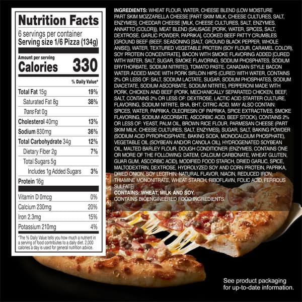 Wheat Flour, Water, Cheese Blend (low Moisture Part Skim Mozzarella Cheese [part Skim Milk, Cheese Cultures, Salt, Enzymes], Cheddar Cheese [milk, Cheese Cultures, Salt, Enzymes, Annatto (color)]), Meat Blend (sausage [pork, Water, Spices, Salt, Dextrose, Garlic Powder, Paprika], Cooked Beef Patty Crumbles [ground Beef (beef, Seasoning [salt, Ground Black Pepper, Whole Anise]), Water, Textured Vegetable Protein (soy Flour, Caramel Color), Soy Protein Concentrate], Bacon With Smoke Flavoring Added [cured With Water, Salt, Sugar, Smoke Flavoring, Sodium Phosphates, Sodium Erythorbate, Sodium Nitrite]), Tomato Paste, Canadian Style Bacon Water Added Made With Pork Sirloin Hips (cured With Water, Contains 2% Or Less Of: Salt, Sodium Lactate, Sugar, Sodium Phosphates, Sodium Diacetate, Sodium Ascorbate, Sodium Nitrite), Pepperoni Made With Pork, Chicken And Beef (pork, Mechanically Separated Chicken, Beef, Salt, Contains 2% Or Less Of: Dextrose, Lactic Acid Starter Culture, Flavoring, Sodium Nitrite, Bha, Bht, Citric Acid. May Also Contain: Spices, Water, Paprika, Oleoresin Of Paprika, Spice Extractives, Smoke Flavoring, Sodium Ascorbate, Ascorbic Acid, Beef Stock), Contains 2% Or Less Of: Yeast, Palm Oil, Brown Rice Flour, Parmesan Cheese (part Skim Milk, Cheese Cultures, Salt, Enzymes), Sugar, Salt, Baking Powder (sodium Acid Pyrophosphate, Baking Soda, Monocalcium Phosphate), Vegetable Oil (soybean And/or Canola Oil), Hydrogenated Soybean Oil, Malted Barley Flour, Dough Conditioner (enzymes, Contains One Or More Of The Following: Datem, Calcium Carbonate, Wheat Gluten, Guar Gum, Ascorbic Acid), Modified Food Starch, Dried Garlic, Spice, Maltodextrin, Dextrose, Hydrolyzed Soy And Corn Protein, Paprika, Dried Onion, Soy Lecithin, Natural Flavor, Niacin, Reduced Iron, Thiamine Mononitrate, Wheat Starch, Riboflavin, Folic Acid, Ferrous Sulfate.