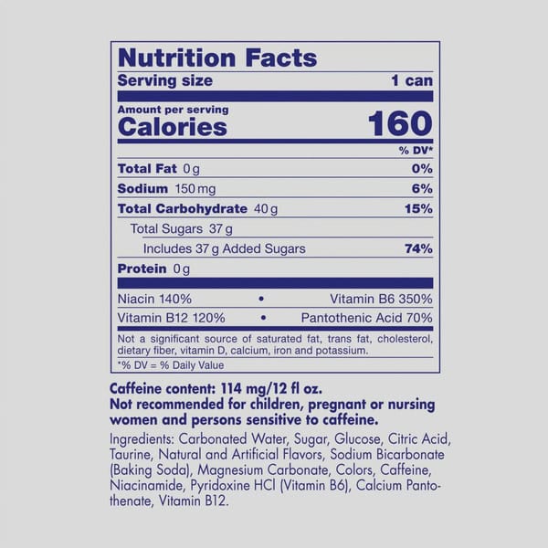 Carbonated Water, Sucrose, Glucose, Citric Acid, Taurine, Sodium Bicarbonate, Magnesium Carbonate, Caffeine, Niacinamide, Calcium Pantothenate, Pyridoxine Hci, Vitamin B12, Natural And Artificial Flavors, Colors