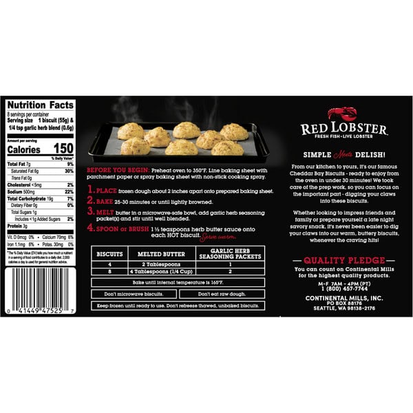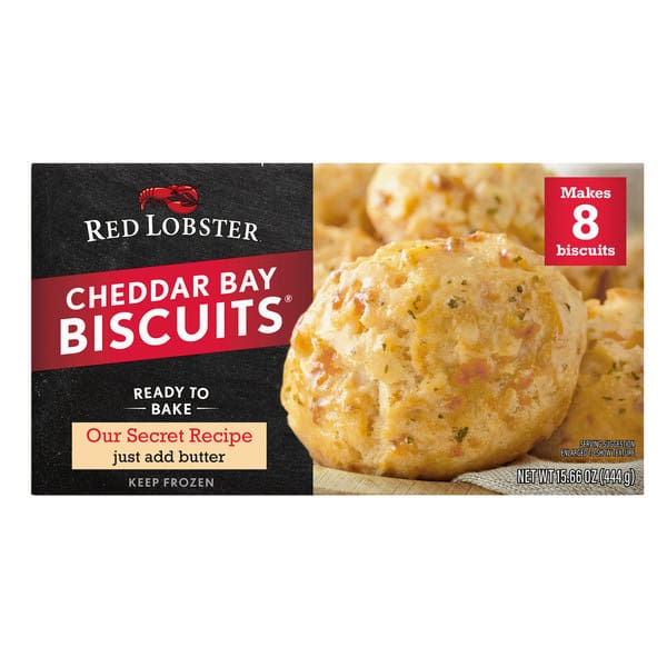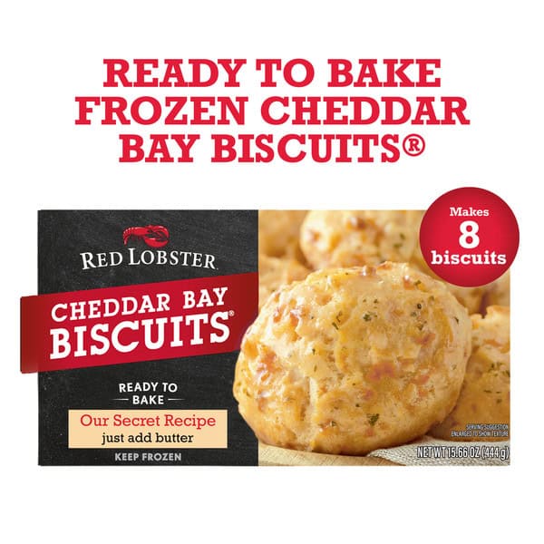 Our legendary Red Lobster Cheddar Bay Biscuit®, enjoy ready to bake Red Lobster Cheddar Bay Biscuits, fresh from your oven in under 30 minutes. We took care of the prep, so you can focus on the important part—digging your claws into these Red Lobster biscuits! This pack includes eight frozen biscuits and our classic garlic herb seasoning. These Red Lobster Cheddar Bay Biscuits are ridiculously easy to make: simply pop them into the oven, bake as many individual frozen biscuits as you would like until golden brown, then mix the signature garlic herb seasoning with melted butter and brush over the warm biscuits. Whether you’re enjoying them with eggs for breakfast or as a side dish to a home cooked dinner—these warm, buttery biscuits steal the show. Red Lobster biscuits are made with the ingredients you love, for meals you and your family deserve.