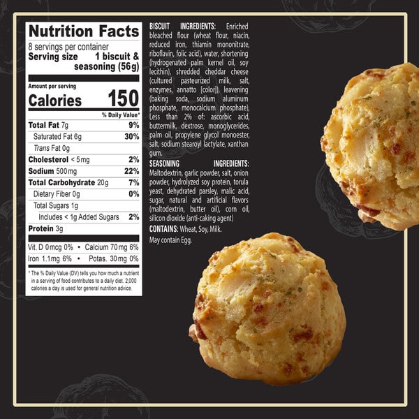 Biscuit Ingredients: Enriched Bleached Flour (wheat Flour, Niacin, Reduced Iron, Thiamin Mononitrate, Riboflavin, Folic Acid), Water, Shortening (hydrogenated Palm Kernel Oil, Soy Lecithin), Shredded Cheddar Cheese (cultured Pasteurized Milk, Salt, Enzymes, Annatto [color]), Leavening (baking Soda, Sodium Aluminum Phosphate, Monocalcium Phosphate), Less Than 2% Of: Ascorbic Acid, Buttermilk, Dextrose, Monoglycerides, Palm Oil, Propylene Glycol Monoester, Salt, Sodium Stearoyl Lactylate, Xanthan Gum, Seasoning Ingredients: Maltodextrin, Garlic Powder, Salt, Onion Powder, Hydrolyzed Soy Protein, Torula Yeast, Dehydrated Parsley, Malic Acid, Sugar, Natural And Artificial Flavors (maltodextrin, Butter Oil), Corn Oil, Silicon Dioxide (anti-caking Agent)