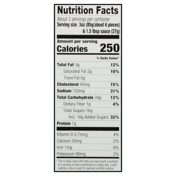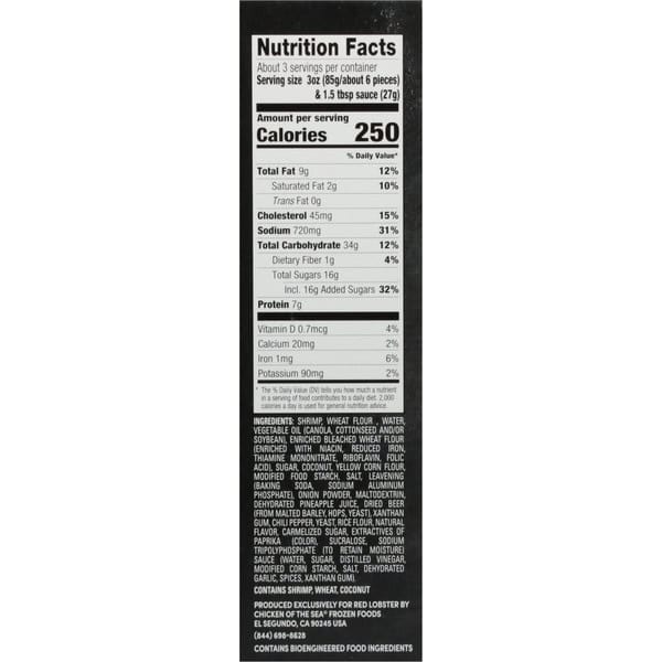 Shrimp, Enriched Bleached Wheat Flour (bleached Wheat Flour, Niacin, Reduced Iron, Thiamine Mononitrate, Riboflavin, Folic Acid), Breadcrumbs (enriched Bleached Wheat Flour (wheat Flour, Niacin, Reduced Iron, Thiamine Mononitrate, Riboflavin, Folic Acid), Leavening (sodium Acid Pyrophosphate, Sodium Bicarbonate), Dextrose, Salt, Monoglycerides [emulsifier), Yeast, Extractives Of Paprika [color], Dough Conditioners (ascorbic Acid, L-cysteine Monohydrochloride), Spice Extractives), Coconut, Sugar, Yellow Corn Flour, Modified Food Starch, Salt, Leavening (sodium Bicarbonate, Sodium Aluminum Phosphate), Water, Chili Pepper, Onion Powder, Xanthan Gum, Dehydrated Pineapple Juice, Dried Beer (from Malted Barley, Hops, Yeast), Maltodextrin, Natural Flavors, Sucralose, Sodium Tripolyphosphate (to Retain Moisture). Sauce (water, Sugar, Distilled Vinegar, Modified Corn Starch, Salt, Dehydrated Garlic, Spices, Xanthan Gum).