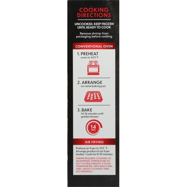 Cook thoroughly. Cooking Directions: Uncooked. Keep frozen until ready to cook. Remove shrimp from packaging before cooking. Conventional Oven: 1. Preheat oven to 425 degrees F. 2. Arrange on metal baking pan. 3. Bake 14-16 minutes until golden brown. Air Frying: Preheat air fryer to 375 degrees F. Arrange product in air fryer basket. Cook for 8-10 minutes. Shrimp requires cooking to an internal temperature of 165 degrees F as measured by a food thermometer. Appliances may vary. Adjust cooking times accordingly.