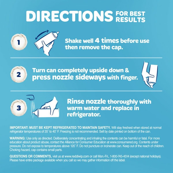 Directions: For best results. 1. Shake well 4 times before use then remove cap. 2. Turn can completely upside down & press nozzle sideways with finger. 3. Rinse nozzle thoroughly with warm water and replace in refrigerator.