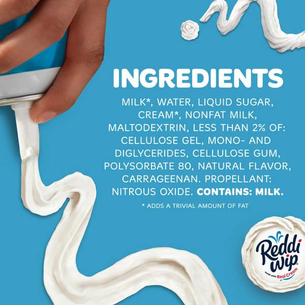 Milk*, Water, Cream*, Sugar, Nonfat Milk, Maltodextrin, Less Than 2% Of: Cellulose Gel, Mono- And Diglycerides, Cellulose Gum, Polysorbate 80, Carrageenan, Natural Flavor. Propellant: Nitrous Oxide.