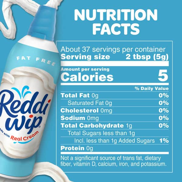 Reddi Wip Fat Free Dairy Whipped Topping serves up the same delicious, rich cream taste as Reddi Wip Original without the fat. This dairy whipped topping offers a classic texture and dairy flavor you know and love. You won’t miss the other whipped cream products you were using before. Made with real milk and cream, this whipped cream contains no artificial flavors or artificial sweeteners. Not only is this dessert topping 5 calories per serving, but it is made without hydrogenated oils, which are commonly found in other whipped topping products. It is also gluten free, keto friendly (0g of protein, 1g net carbs [1g total carbs minus 0g dietary fiber], and 1g added sugar per serving) and fits a low carb lifestyle(1g net carbs per serving [1g total carbs minus 0g dietary fiber]). Add an indulgent, delicious flavor to ice cream sundaes, strawberry shortcake, pies and other desserts or use it as a topping for fruit, pancakes and hot cocoa.