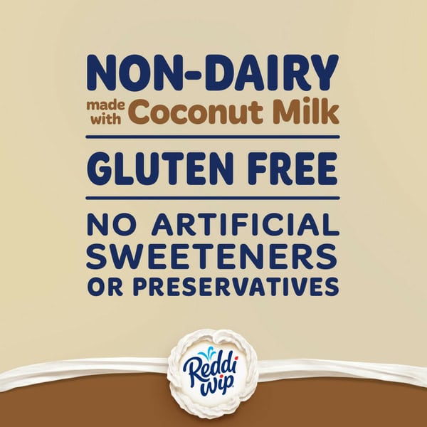 Reddi Wip Non Dairy Whipped Topping Made with Coconut Milk serves up a deliciously creamy flavor that can make a classic and versatile topping. The non dairy whipped topping version of Reddi Wip whipped topping has that classic texture and delicious flavor. You won’t miss the other coconut whipped cream products or dairy whipped toppings you were using before. This vegan whipped topping has all of the Reddi Wip goodness you love, but is made with coconut milk and made without dairy ingredients. Like the classic, original whipped topping, it is also made with no artificial flavors or artificial sweeteners. Not only is this dessert topping 10 calories per serving, but it is also vegan, gluten free, keto friendly (0g of protein, 2g net carbs [2g total carbs minus 0g dietary fiber], and 1g added sugar per serving) and it fits a low carb lifestyle (2g net carbs per serving [2g total carbs minus 0g dietary fiber]).