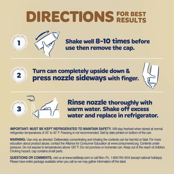 Directions for Best Results: 1. Rotate bottom 1/3 of can under warm water (not hot!) for 30 seconds. Dry can and cap. 2. Shake well 8-10 times before use then remove cap. 3. Turn can completely upside down and press nozzle sideways with finger. 4. Rinse nozzle thoroughly with warm water and replace in refrigerator.