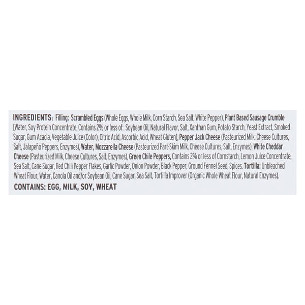 Filling: Scrambled Eggs (whole Eggs, Whole Milk, Corn Starch, Sea Salt, White Pepper), Plant Based Sausage Crumble [water, Soy Protein Concentrate, Soy Oil, Contains 2% Or Less Of Inulin, Yeast Extract, Maltodextrin, Modified Corn Starch, Natural Flavor (from Plant Sources), Evaporated Cane Sugar, Caramel Color, Barley Malt Extract, Potassium Chloride, Soy Sauce (water, Soybeans, Salt, Wheat), Dried Onion, Molasses, Torula Yeast Extract, Natural Smoke Flavor, Dried Garlic], Pepper Jack Cheese (pasteurized Milk, Cheese Cultures, Salt, Jalapeno Peppers, Enzymes), Mozzarella Cheese (pasteurized Milk, Cheese Cultures, Salt, Enzymes), White Cheddar Cheese (pasteurized Milk, Cheese Cultures, Salt, Enzymes), Lemon Juice, Contains 2% Or Less Of Green Chile, Corn Starch, Sea Salt, Garlic Powder, Onion Powder, Spices, Cane Sugar, Tortilla: Unbleached Wheat Flour, Water, Canola Oil And/or Soybean Oil, Cane Sugar, Sea Salt