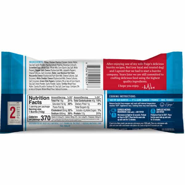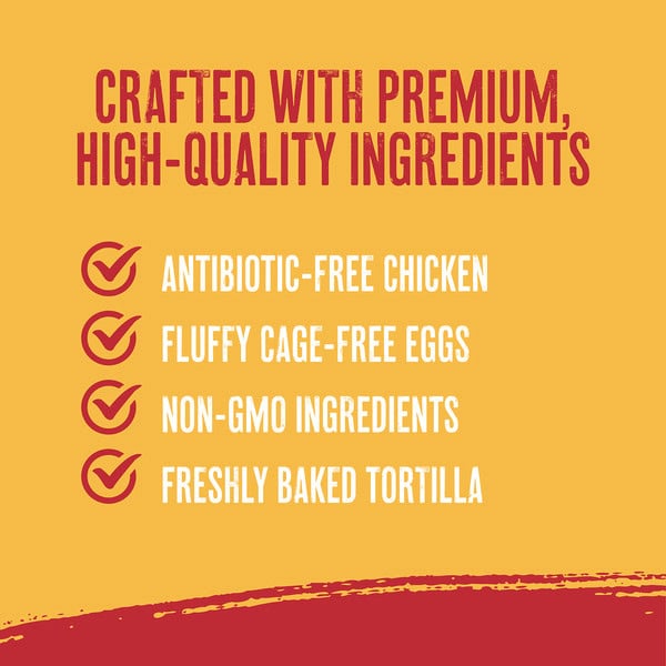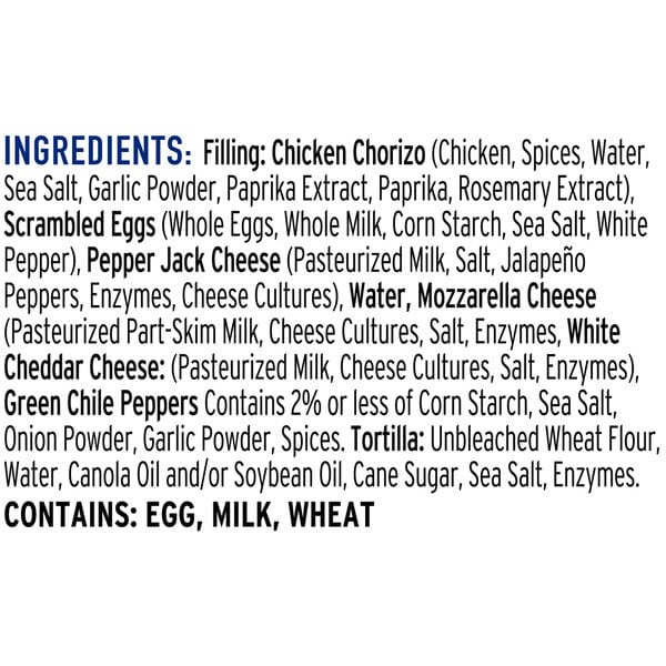Filling: Chicken Chorizo (chicken, Spices, Water, Sea Salt, Garlic Powder, Paprika Extract, Paprika, Rosemary Extract), Scrambled Eggs (cage Free Whole Eggs, Whole Milk, Non-gmo Corn Starch, Sea Salt, Ground White Pepper), Pepper Jack Cheese (pasteurized Milk, Cheese Cultures, Salt, Jalapeno Peppers, Enzymes), Water, Mozzarella Cheese (pasteurized Milk, Cheese Cultures, Salt, Enzymes), White Cheddar Cheese (pasteurized Milk, Cheese Cultures, Salt, Enzymes), Contains 2% Or Less Of Non-gmo Corn Starch, Garlic Powder, Green Chile Pepper, Onion Powder, Sea Salt, Spice. Tortilla: Unbleached Wheat Flour, Water, Non-gmo Canola Oil And/or Soybean Oil, Non-gmo Sugar, Sea Salt, Yeast.