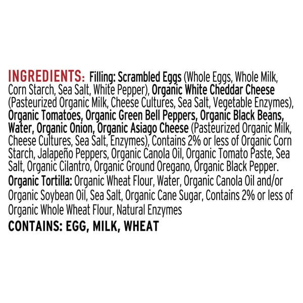 Filling: Organic Scrambled Eggs (organic Whole Eggs, Organic Whole Milk, Organic Corn Starch, Sea Salt, Organic White Pepper), Organic Tomatoes, Organic White Milk Cheddar Cheese (pasteurized Cultured Organic Milk, Sea Salt, Vegetable Enzymes), Organic Green Pepper, Organic Black Beans, Organic Onion, Organic Asiago Cheese {(pasteurized Organic Milk, Cheese Cultures, Sea Salt, Enzymes), Organic Corn Starch, Contains 2% Or Less Of Organic Canola Oil, Organic Cilantro, Organic Jalapeno, Organic Spices, Sea Salt, Water. Tortilla: Organic Whole Wheat Flour, Organic Wheat Flour, Water, Organic Soybean Oil, Sea Salt, Organic Sugar.