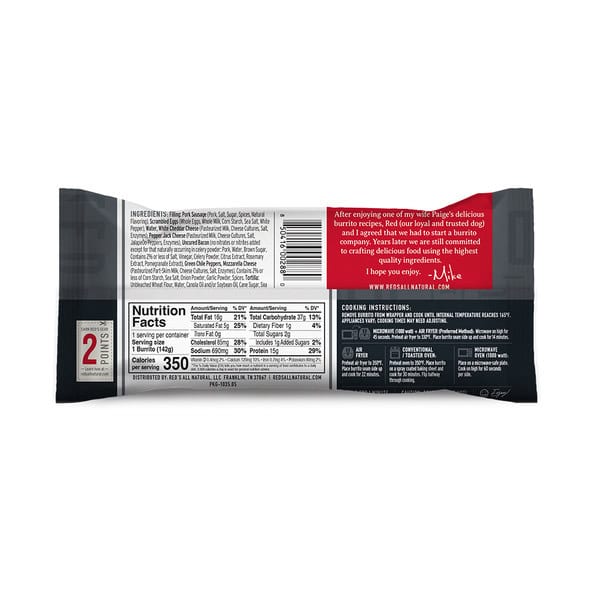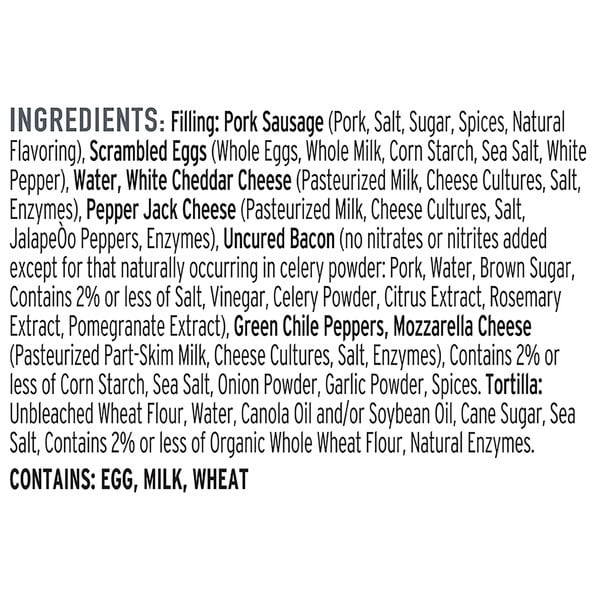 Filling: Pork Sausage (pork, Salt, Sugar Spices, Natural Flavoring), Organic Scrambled Eggs (organic Whole Eggs, Organic Whole Milk, Organic Corn Starch, Sea Salt, Organic White Pepper), Pepper Jack Cheese (pasteurized Milk, Jalapeno Peppers, Cheese Cultures, Salt, Enzymes), Water, Mozzarella Cheese (pasteurized Part-skim Milk, Cheese Cultures, Salt, Enzymes), Uncured Smoked Bacon Crumbles No Nitrates Or Nitrites Added Except For That Naturally Occurring In Sea Salt And Celery Powder (pork, Water, Brown Sugar, Contains 2% Or Less Of Vinegar, Celery Powder, Citrus Extract, Rosemary Extract, Pomegranate Extract), White Cheddar Cheese (pasteurized Milk, Cheese Cultures Salt, Enzymes), Green Chiles, Contains 2% Or Less Of Corn Starch, Garlic Powder, Onion Powder, Spice. Tortilla: Unbleached Wheat Flour, Water, Canola Oil And/or Soybean Oil, Cane Sugar, Sea Salt, Yeast.