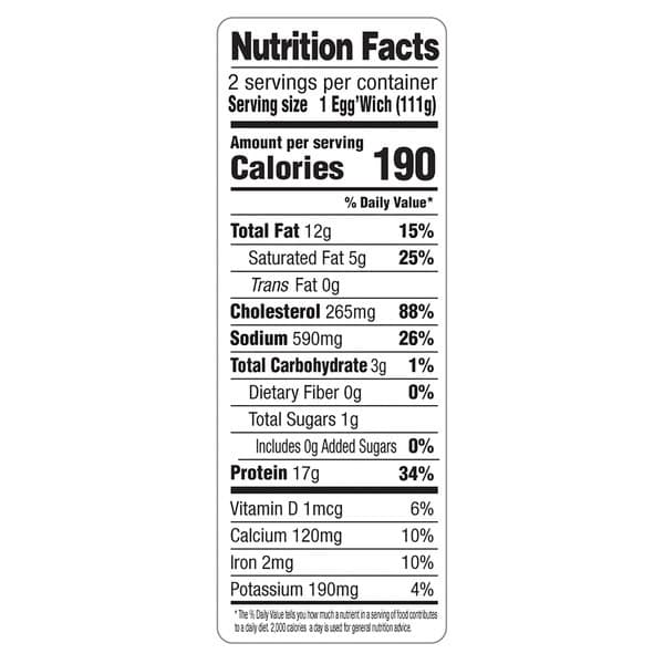 Cook thoroughly. Cooking Instructions: Remove egg’wich from wrapper and cook until internal temperature reaches 165 degrees. Appliances vary; cooking times may need adjusting. Microwave Oven (1000 watt): Remove Egg’wich from wrapper. Wrap in a damp paper towel and place on a microwave-safe plate. Microwave on high for 50 seconds. Flip Egg’Wich and microwave an additional 50 seconds. Enjoy! Let sit for 1 minute. Caution: Contents are hot!