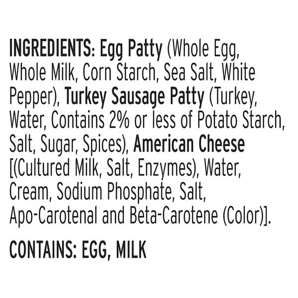 Egg Patty (whole Egg, Whole Milk, Corn Starch, Sea Salt, White Pepper), Turkey Sausage Patty (turkey, Water, Contains 2% Or Less Of Potato Starch, Salt, Sugar, Spices), American Cheese [(cultured Milk, Salt, Enzymes), Water, Cream, Sodium Phosphate, Salt, Apo-carotenal And Beta-carotene (color)].