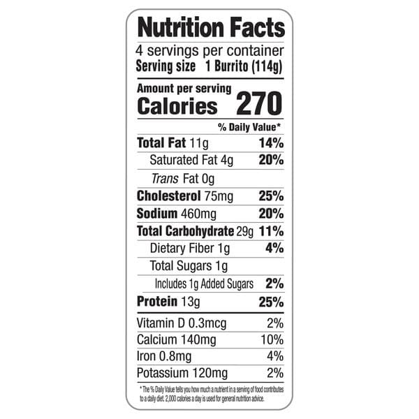 Cook thoroughly. Remove burrito from wrapper and cook until internal temperature reaches 165 degrees F. Appliances vary; cooking times may need adjusting. Microwave (1000 watt) + Air Fryer (Preferred Method): Microwave on high for 30 seconds. Preheat air fryer to 330 degrees F. Place burrito seam side up and cook for 12 minutes. Air Fryer: Preheat air fryer to 350 degrees F. Place burrito seam side up and cook for 18 minutes. Conventional / Toaster Oven: Preheat oven to 350 degrees F. Place burrito on a spray coated baking sheet and cook for 25 minutes. Flip halfway through cooking. Microwave Oven (1100 Watt): Place on a microwave-safe plate. Cook on high for 45 seconds per side. Enjoy! Let sit for 1 minute. Caution: Contents are hot!