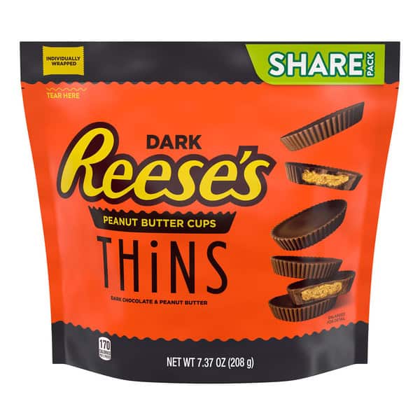 • Contains one (1) 7.37-ounce share pack of REESE’S THiNS Dark Chocolate Peanut Butter Cups Candy