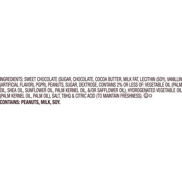 Semi-sweet Chocolate (sugar, Chocolate, Cocoa Butter, Milk Fat, Lecithin (soy) Vanillin (artificial Flavor), Pgpr), Peanuts, Sugar, Dextrose, Contains 2% Or Less Of: Vegetable Oil (palm Oil, Shea Oil, Sunflower Oil, Palm Kernel Oil, &/or Safflower Oil), Hydrogenated Vegetable Oil (palm Kernel Oil, Palm Oil), Salt, Tbhq & Citric Acid (to Maintain Freshness). Ud