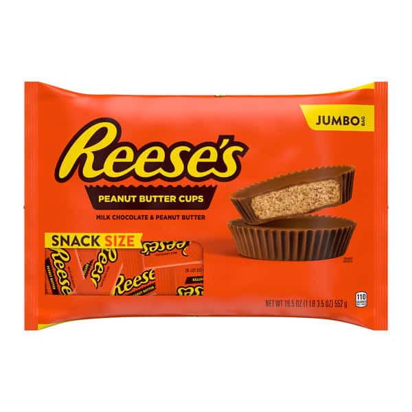 • Contains one (1) 19.5-ounce jumbo bag of REESE’S Milk Chocolate Snack Size Peanut Butter Cups Candy