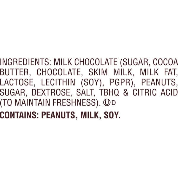 Milk Chocolate (sugar, Coco Butter, Chocolate, Skim Milk, Milk Falactose, Lecithin (soy), Pgpr), Peanuts, Sugar, Dextrose, Salt, Tbhq, Citric Acid (to Maintain Freshness)