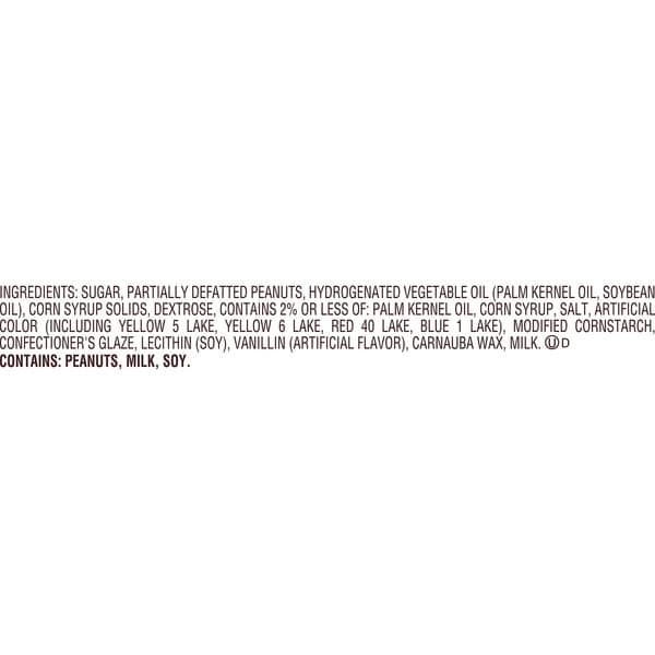 Sugar, Partially Defatted Peanuts, Hydrogenated Vegetable Oil (palm Kernel Oil, Soybean Oil), Corn Syrup Solids, Dextrose, Contains 2% Or Less Of: Palm Kernel Oil, Corn Syrup, Salt, Artificial Color (including Yellow 5 Lake, Yellow 6 Lake, Red 40 Lake, Blue 1 Lake), Modified Cornstarch, Confectioner’s Glaze, Lecithin (soy), Vanillin (artificial Flavor), Carnauba Wax, Milk.