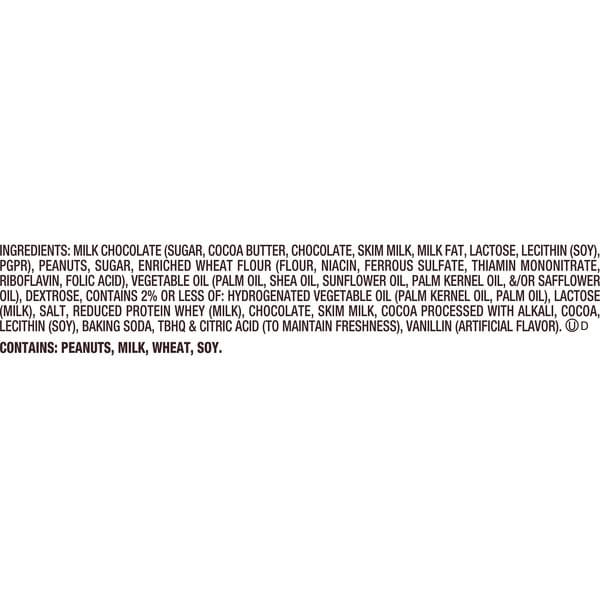 Milk Chocolate [sugar; Cocoa Butter; Chocolate; Milk; Lactose; Milk Fat; Nonfat Milk; Lecithin (soy); Salt; Pgpr, Emulsifier]; Peanuts; Sugar; Enriched Wheat Flour [flour; Niacin; Ferrous Sulfate; Thiamin Mononitrate; Riboflavin; Folic Acid]; Dextrose; Vegetable Oil [palm Oil; Palm Kernel Oil; Shea Oil; Sunflower Oil; And/or Safflower Oil]; Cocoa Butter; Chocolate; Contains 2% Or Less Of: Hydrogenated Vegetable Oil [palm Kernel Oil; Palm Oil]; Salt; Nonfat Milk; Whey (milk); Cornstarch; Lecithin (soy); Baking Soda; Tbhq And Citric Acid, To Maintain Freshness; Vanillin, Artificial Flavor.