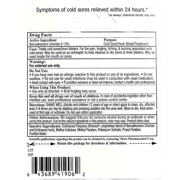 Other Information: We suggest that you not consume alcohol during an outbreak or when using this product. Due to the natural ingredients in this product, color may vary. Product dries clear. 6 cc. Relieve symptoms in just a day! Soothing. Non-irritating. Guaranteed! Fastest healing time – guaranteed! Symptoms of cold sores relieved within 24 hours (as always, individual results may vary). Scientific publications regarding this product can be obtained by contacting. This item is electronically protected.