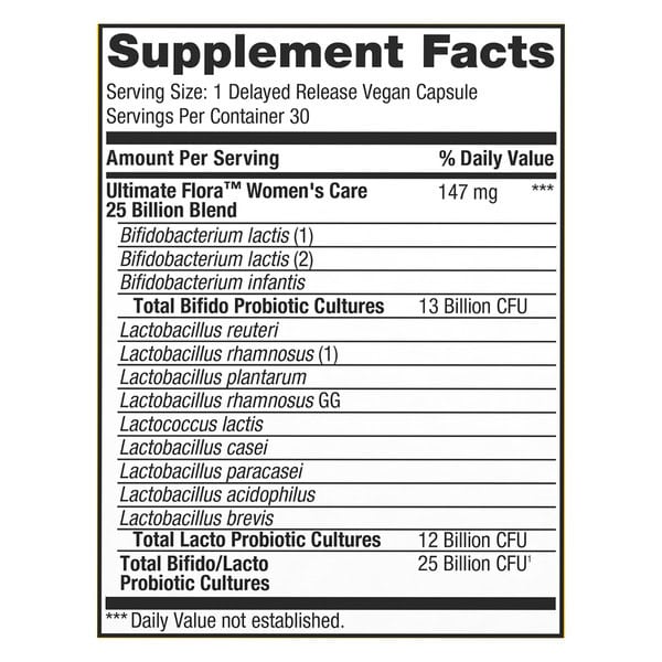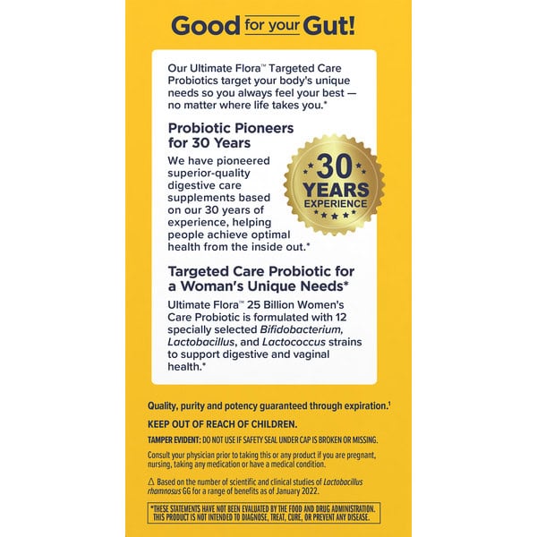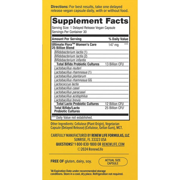 Renew Life Women’s Probiotic Capsules offer 12 probiotic strains to help maintain healthy vaginal bacteria and yeast levels, and support urinary, digestive and immune health (1). Featuring more clinically studied strains than the leading brand (2), these vaginal probiotics contain a blend of 12 different probiotic strains including L. rhamnosus GG, the No. 1 most studied strain (3). With 25 billion cultures, these Renew Life probiotic capsules make it easy for you to support your vaginal, urinary, digestive and immune health. Each strain is clinically tested and formulated by microbiologists and researchers to offer science-backed health benefits you can enjoy every day. These delayed-release capsules help ensure the probiotics reach your gut alive. Potency, quality and purity are guaranteed through the expiration date. For best results, take one capsule daily, with or without food. Refrigeration is recommended, but not required. This daily probiotic supplement offers a Non-GMO Project Verified formula that is gluten-free, dairy-free and soy-free. Renew Life puts health and wellness first with supplements that are backed by over 25 years of clinical trials.