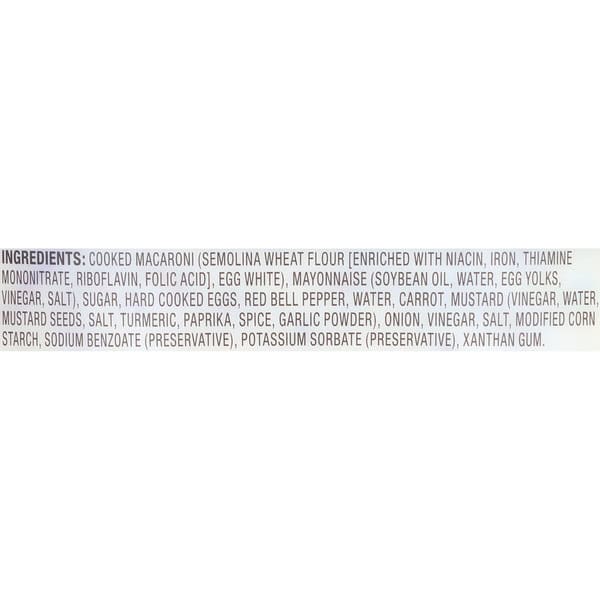 Ingredients: Cooked Macaroni (semolina Wheat Flour (enriched With Niacin, Iron, Thiamine Mononitrate, Riboflavin, Folic Acid), Egg White), Mayonnaise (soybean Oil, Water, Egg Yolks, Vinegar, Salt), Sugar. Hard Cooked Eggs Red Bell Pepper Water Carrot. Mustard (vinegar, Water, Mustard Seeds, Salt, Turmeric. Paprika, Spice, Garlic Powder), Onion, Vinegar, Salt, Modified Corn Starch, Sodium Benzoate (preservative), Potassium Sorbate (preservative), Xanthan Gum.