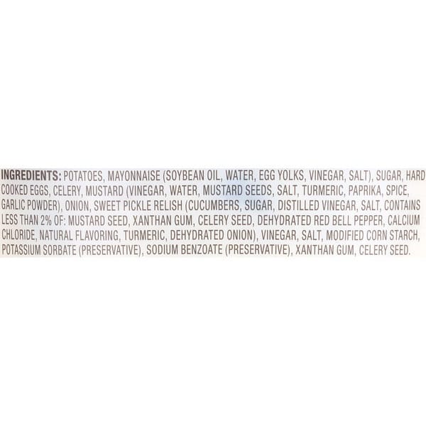 Potatoes, Mayonnaise (soybean Oil, Water, Egg Yolks, Vinegar, Salt), Sugar, Hard Cooked Eggs, Celery, Mustard (vinegar, Water, Mustard Seeds, Salt, Turmeric, Paprika, Spice, Garlic Powder), Onion, Sweet Pickle Relish (cucumbers, Sugar, Distilled Vinegar, Salt, Contains Less Than 2% Of: Mustard Seed, Xanthan Gum, Celery Seed, Dehydrated Red Bell Pepper, Calcium Chloride, Natural Flavoring, Turmeric, Dehydrated Onion), Vinegar, Salt, Modified Corn Starch, Potassium Sorbate (preservative), Sodium Benzoate (preservative), Xanthan Gum, Celery Seed.